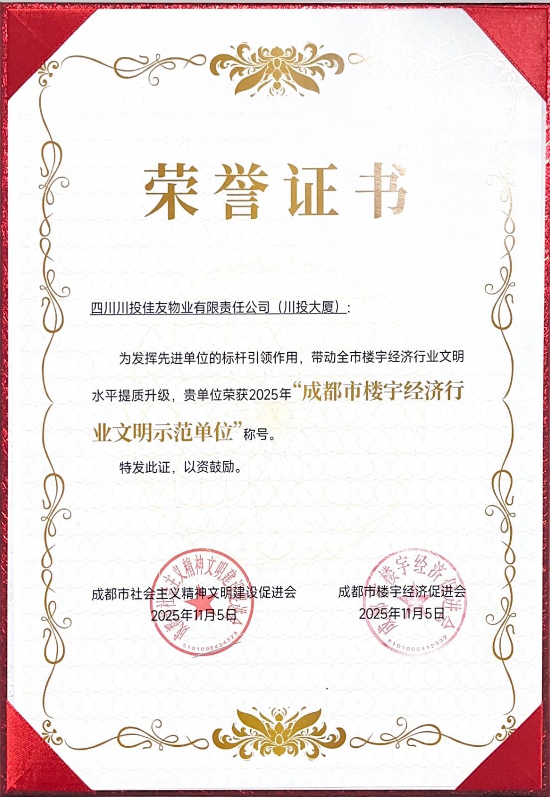 2025年11月5日,在成都市樓宇經(jīng)濟促進會、成都市精神文明建設(shè)促進會聯(lián)合舉辦的“2025成都市樓宇經(jīng)濟行業(yè)文明示范單位”評選中,川投大廈從全市數(shù)百棟高端商務(wù)樓宇中脫穎而出,成功摘得“文明示范單位”稱號。